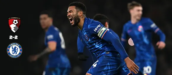 سجل ريس جيمس هدفا من ركلة حرة في الوقت بدل الضائع ليضمن التعادل 2-2 لصالح تشيلسي أمام فريق بورنموث في ستامفورد ب