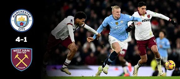 سجل إيرلينج هالاند هدفًا حاسمًا ليضمن مانشستر سيتي فوزًا بنتيجة 4-1 على وست هام يونايتد، مسجلاً انتصاريه المتت