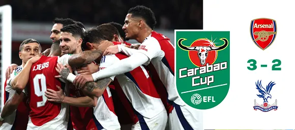 Arsenal FC defeated Crystal Palace 3-2 in the EFL Cup quarter-finals, thanks to Gabriel Jesus' hat-trick and Eddie Nketiah's late header, securing a 3-2 victory.